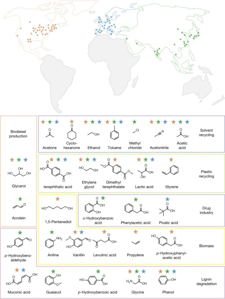由于化学工业持续的产生大量废物化学品,因此发展“循环化学”方法将生产的废物重新高效率的反向转化为有价值的产品具有非常高的意义。目前人们在降解有害化学品领域得到巨大的进展,但是通过“闭环”方式将废品转化为具有价值的产品还没有比较好的突破进展。分析如何将广泛的各类化学废品转化得到具有价值的产品是个非常困难的工作,因为当仅仅少数底物就能够在几步反应过程种生成数以百万量级的产物,并且因此形成错综复杂的可能产物网络。对所有的合成过程路径进行追踪,筛选可能符合绿色化学的路径目前对于化学工作者仍是未知的。