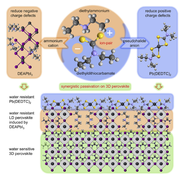 等人提出了一种离子对钝化剂二乙基二硫代氨基甲酸二乙铵,它同时提供阳离子和阴离子,它可以通过形成强化学键将卤化铅钙钛矿的表面转化为两种类型的防水组合物。