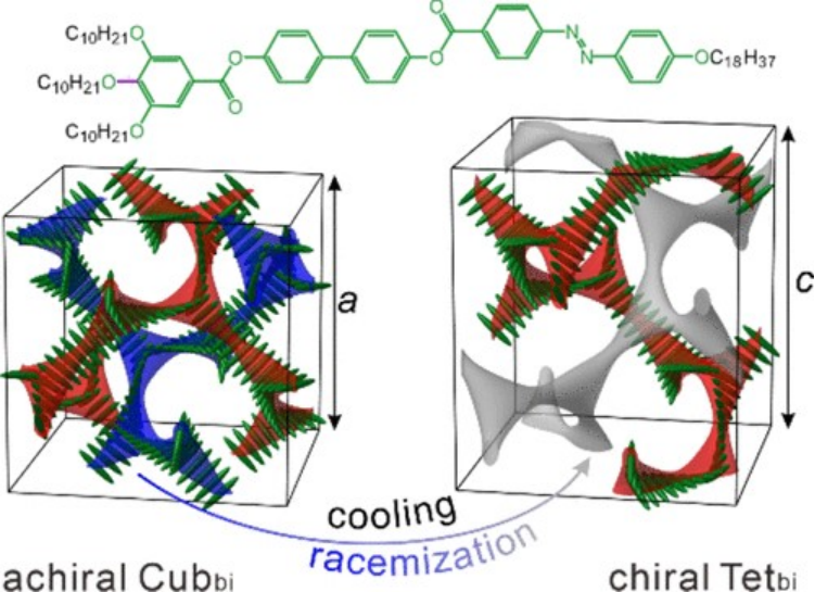 2)研究人员发现不仅生产了一种新的双连续网络型三维中间相,而且还揭示了软物质在从对映体亲性到对映体憎性螺旋间自组装转变过程中,部分介观结构外消旋导致镜像对称性破缺的机制。