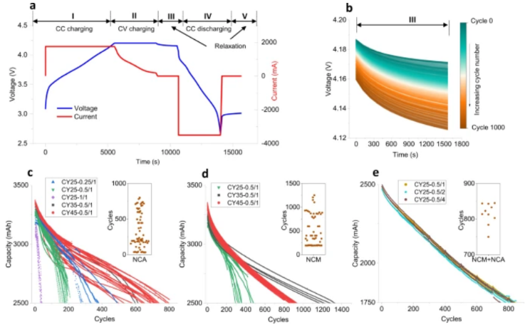 1)在该工作中研究人员使用了三个数据集,其中一个数据集是借助使用LiNi0.86Co0.11Al0.03O2正极材料的电池进行模型构建,另外两个数据集则是用来进行容量评估的对象,它们分别基于LiNi0.83Co0.11Mn0.07O2正极的锂离子电池和NCM-NCA混合正极的锂离子电池。