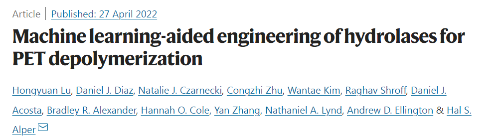 为了解决这一问题,来自德克萨斯大学奥斯汀分校的 Hal Alper 团队与 Andrew Ellington 团队,Nathaniel Lynd 团队以及 Yan Zhang 团队合作,开发了可在常温下高效发挥解聚作用的 PET 水解酶 FAST-PETase,相关研究成果于 2022 年 4 月 27 日以 “Machine learning-aided engineering of hydrolases for PET depolymerization” 一文发表在 Nature 上。
