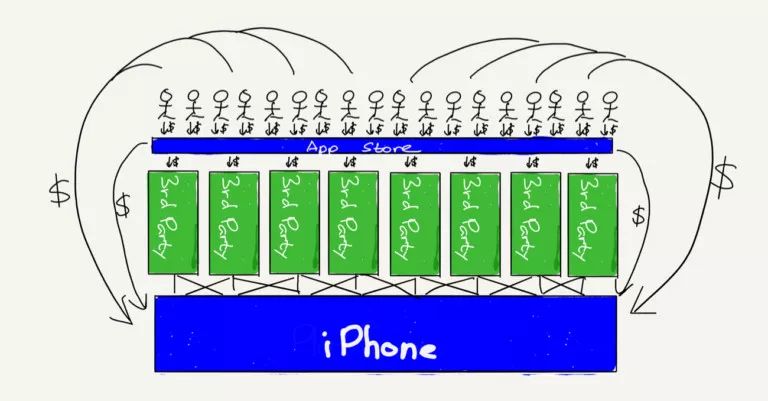第三,这也适用于Steam,App Store大幅降低了开发者的进入壁垒,产生了更多的应用程序,吸引了更多的用户,进而形成循环,产生更多的应用程序,既能够将应用程序锁定,作为竞争优势,又确保没有一个应用程序拥有过大的权力(让苹果可以通过命令限制 Steam 这样的竞争对手)。