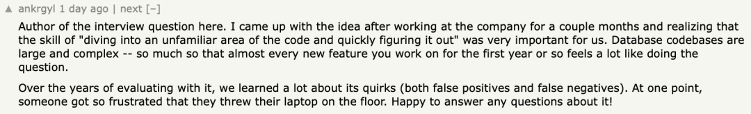 有趣的是,出这道题的作者也看到了这个帖子并且回复称,自己是在工作了几个月之后想出来的。作者表示,数据库的代码非常庞大而且复杂,对于最开始的那一年,几乎每次维护都像是在做题。显然,「快速弄清楚一段不熟悉的代码块」这个技能,可以说是相当的重要了