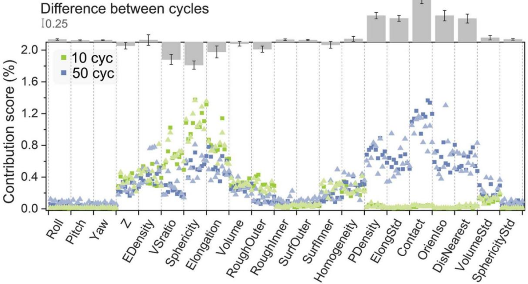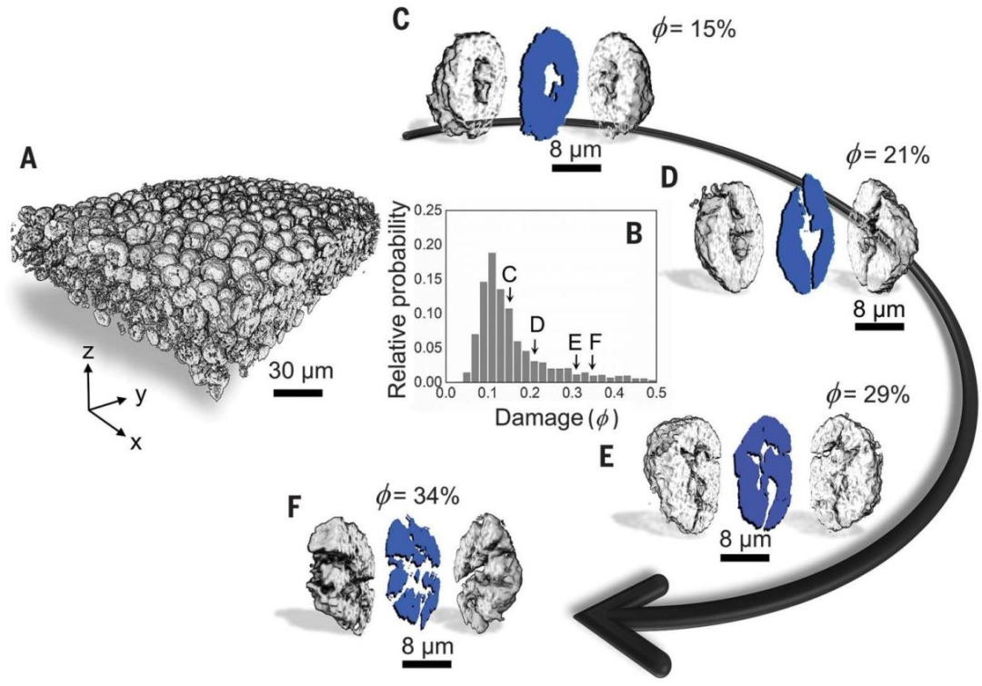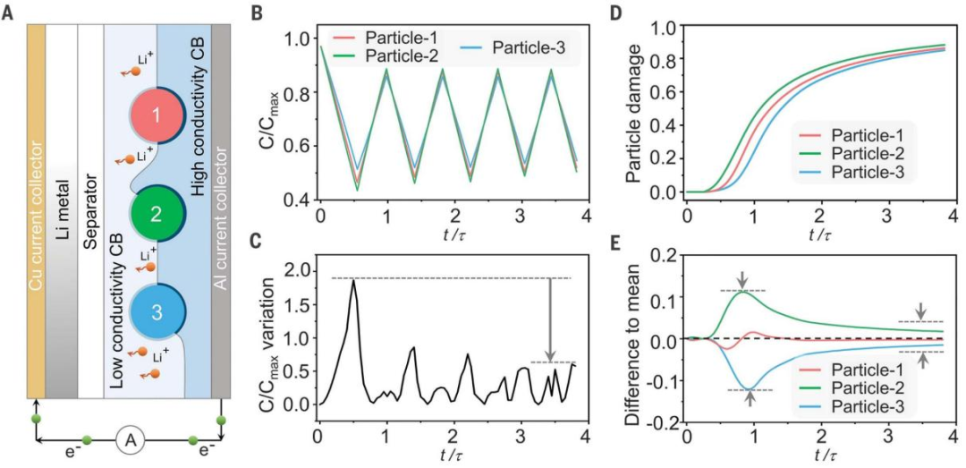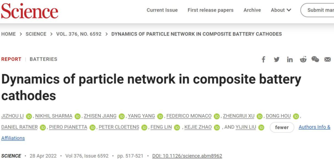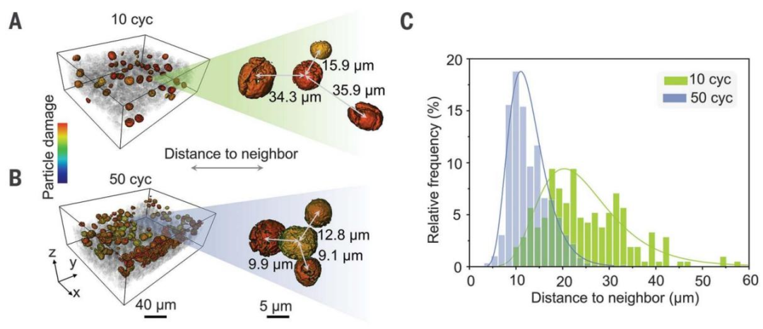 基于此,美国SLAC国家加速器实验室刘宜晋研究员,普渡大学赵克杰教授以及美国弗吉尼亚理工大学林锋教授(共同通讯作者)使用纳米分辨率的硬X射线相位衬度全息断层成像技术,对不同状态下(在扣式电池中循环10次和50次)的多层LiNi0.8Mn0.1Co0.1O2(NMC)颗粒的厚高镍复合正极进行成像,其能够随时间跟踪数千颗单个颗粒的行为,从而确定结构和性能之间的关系,以及获得正极材料在通常无法获得的尺寸范围内的损坏情况。凭借高空间分辨率和对比度,3D成像数据涵盖了大量表现出多种损伤模式的活性颗粒。同时,为了便于统计分析,在之前建立的神经网络的颗粒识别方法的基础上,通过开发对角线数据融合方法来提高其准确性和效率。此外,使用该方法完成颗粒识别后,进一步量化单个颗粒的损伤程度。研究表明,在正极内部,单个颗粒的形态缺陷和电化学活性通过三个不同的阶段共同演化和过渡:单颗粒激活,电极颗粒开始参与电化学反应;其次是颗粒之间的分离,颗粒的利用和对颗粒的破坏程度各不相同;最后,全局均质化,电化学活性和机械损伤之间的调节减少了这些变化。基于模型,具有较高电化学活性的颗粒更容易受到机械损伤,这种机械损伤反过来会通过增加电阻来抑制电化学反应。此外,本文强调了高通量分析的必要性,以及电化学活性颗粒的形态和化学一致性对于电极对充放电循环稳定性的重要性。在某些情况下,有目的地将不同尺寸的颗粒混合物填充到电极中以增加电极密度,前提是颗粒小于临界尺寸,超过该临界尺寸就会发生开裂。然而,在学术研究中,工业使用的相同材料的尺寸、形状和表面特性通常存在相当大的差异,这可能导致结果不一致。相关研究成果以“Dynamics of particle network in composite battery cathodes”为题发表在Science上。 03