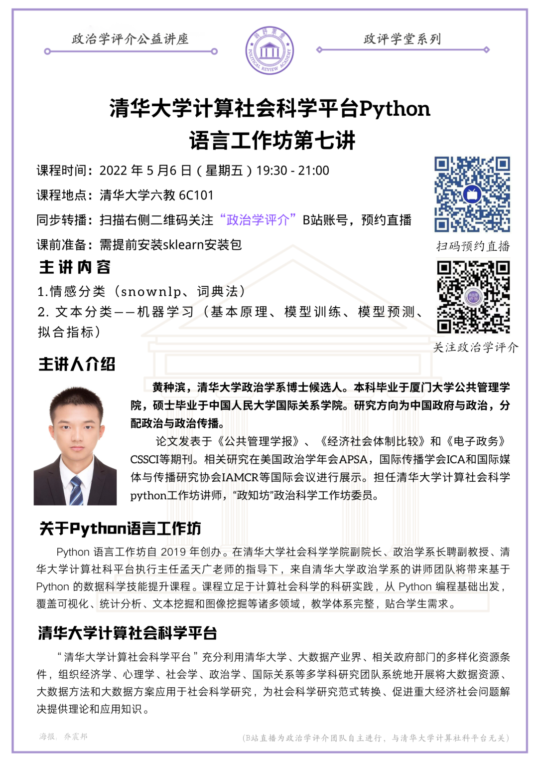Python 语言工作坊自 2019 年创办。在清华大学社会科学学院副院长、政治学系长聘副教授、清华大学计算社科平台执行主任孟天广老师的指导下,来自清华大学政治学系的讲师团队将带来基于 Python 的数据科学技能提升课程。课程立足于计算社会科学的科研实践,从 Python 编程基础出发,覆盖可视化、统计分析、文本挖掘和图像挖掘等诸多领域,教学体系完整,贴合学生需求。