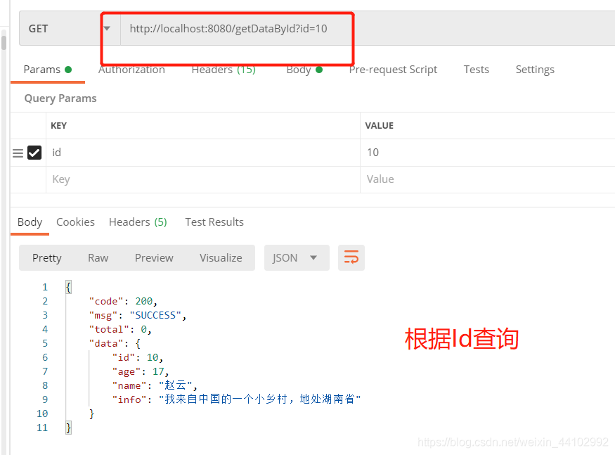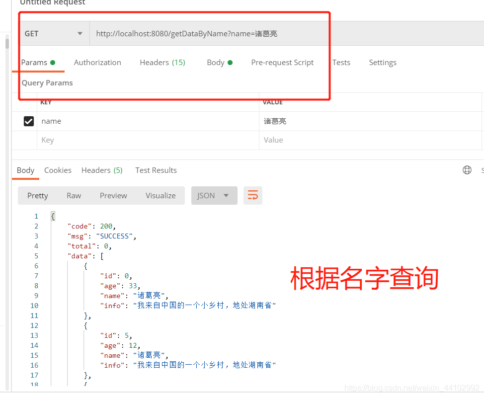 "赵云" ,"小乔" ,"狄仁杰" ,"李四" ,"诸小明" ,"王五" }; private String[] infos={"我来自中国的一个小乡村,地处湖南省" ,"我来自中国的一个大城市,名叫上海,人们称作魔都" ,"我来自东北,家住大囤里,一口大碴子话" }; @LogAnnotation (requestRemark = "存数据" ) @GetMapping ("saveUser" ) public ResultVO saveUser () { //添加索引mapping 索引会自动创建但mapping自只用默认的这会导致分词器不生效 所以这里我们手动导入mapping elasticsearchTemplate.putMapping(User.class ) ; Random random = new Random(); List users = new ArrayList<>(); for (int i=0 ;i<20 ;i++){ User user = new User(); user.setId(i); user.setName(names[random.nextInt(9 )]); user.setAge(random.nextInt(40 )+i); user.setInfo(infos[random.nextInt(2 )]); users.add(user); } Iterable users1 = esUserService.saveAll(users); return new ResultVO(users1); } @LogAnnotation (requestRemark = "根据id查询数据" ) @GetMapping ("getDataById" ) public ResultVO getDataById (Integer id) { return new ResultVO(esUserService.findById(id)); } @LogAnnotation (requestRemark = "分页查询所有数据" ) @GetMapping ("getAllDataByPage" ) public ResultVO getAllDataByPage () { //本该传入page和size,这里为了方便就直接写死了 Pageable page = PageRequest.of(0 ,10 , Sort.Direction.ASC,"id" ); Page all = esUserService.findAll(page); return new ResultVO(all.getContent()); } @LogAnnotation (requestRemark = "根据名字查询" ) @GetMapping ("getDataByName" ) public ResultVO getDataByName (String name) { return new ResultVO(esUserService.findByName(name)); } @LogAnnotation (requestRemark = "根据名字和介绍查询" ) @GetMapping ("getDataByNameAndInfo" ) public ResultVO getDataByNameAndInfo (String name,String info) { //这里是查询两个字段取交集,即代表两个条件需要同时满足 return new ResultVO(esUserService.findByNameAndInfo(name,info)); } } 测试结果: