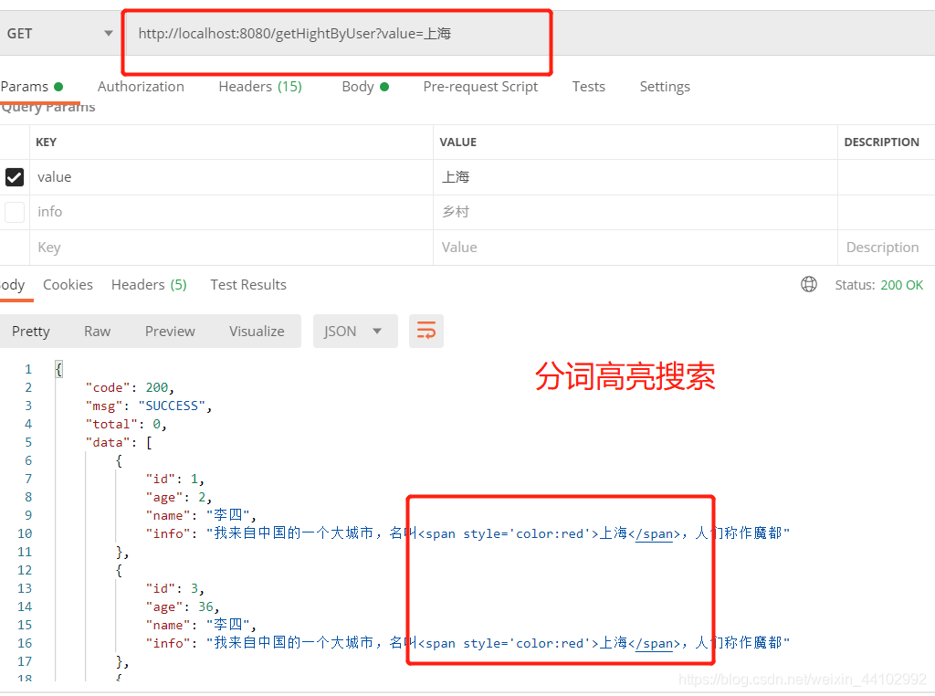 分词高亮查询 @LogAnnotation (requestRemark = "查询高亮显示" ) @GetMapping ("getHightByUser" ) public ResultVO getHightByUser (String value) { //根据一个值查询多个字段 并高亮显示 这里的查询是取并集,即多个字段只需要有一个字段满足即可 //需要查询的字段 BoolQueryBuilder boolQueryBuilder= QueryBuilders.boolQuery() .should(QueryBuilders.matchQuery("info" ,value)) .should(QueryBuilders.matchQuery("name" ,value)); //构建高亮查询 NativeSearchQuery searchQuery = new NativeSearchQueryBuilder() .withQuery(boolQueryBuilder) .withHighlightFields( new HighlightBuilder.Field("info" ) ,new HighlightBuilder.Field("name" )) .withHighlightBuilder(new HighlightBuilder().preTags("" ).postTags(" " )) .build(); //查询 SearchHits search = elasticsearchTemplate.search(searchQuery, User.class ) ; //得到查询返回的内容 List> searchHits = search.getSearchHits(); //设置一个最后需要返回的实体类集合 List users = new ArrayList<>(); //遍历返回的内容进行处理 for (SearchHit searchHit:searchHits){ //高亮的内容 Map> highlightFields = searchHit.getHighlightFields(); //将高亮的内容填充到content中 searchHit.getContent().setName(highlightFields.get("name" )==null ? searchHit.getContent().getName():highlightFields.get("name" ).get(0 )); searchHit.getContent().setInfo(highlightFields.get("info" )==null ? searchHit.getContent().getInfo():highlightFields.get("info" ).get(0 )); //放到实体类中 users.add(searchHit.getContent()); } return new ResultVO(users); } 测试结果: