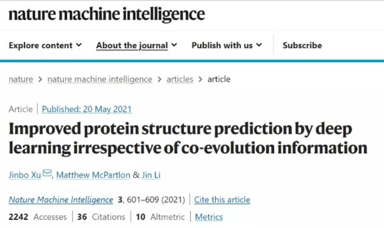 1、Jinbo Xu et al. Improved protein structure prediction by deep learning irrespective of co-evolution information. Nature Machine Intelligence 3, pages601–609(2021)https://doi.org/10.1038/s42256-021-00348-5