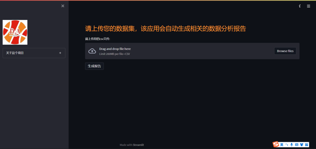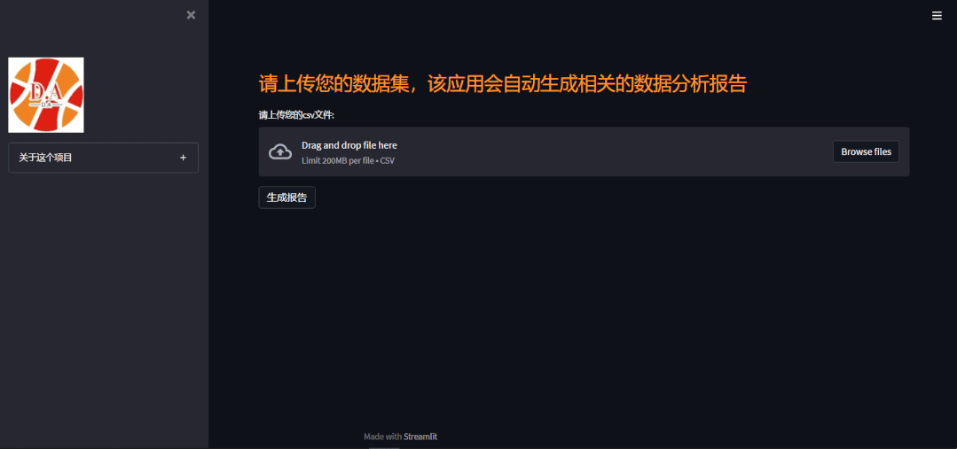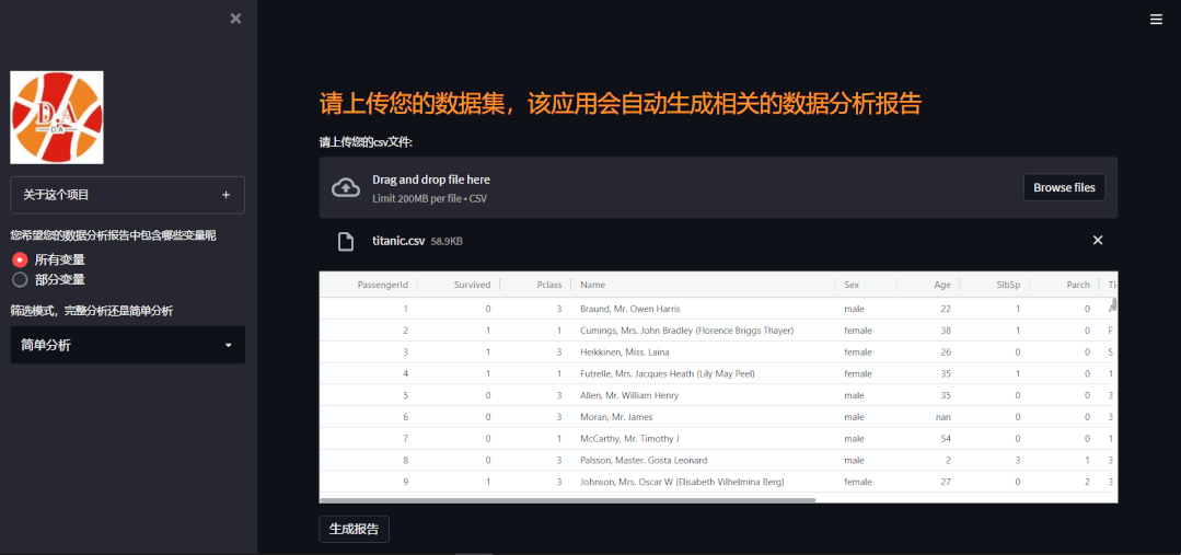 该项目是将streamlit和pandas_profiling相结合,在您上传数据集之后自动生成相关的数据分析报告,当然该项目提供了两种模式 全量分析还是部分少量分析,这里推荐用部分少量分析,因为计算量更少,所需要的时间更短,效率更高