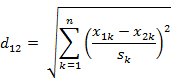 经过简单的推导就可以得到两个n维向量a(x11,x12,…,x1n)与 b(x21,x22,…,x2n)间的标准化欧氏距离的公式: