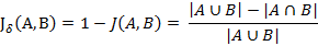 与杰卡德相似系数相反的概念是杰卡德距离(Jaccard distance)。杰卡德距离可用如下公式表示: