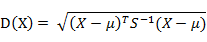 有M个样本向量X1~Xm,协方差矩阵记为S,均值记为向量μ,则其中样本向量X到u的马氏距离表示为: