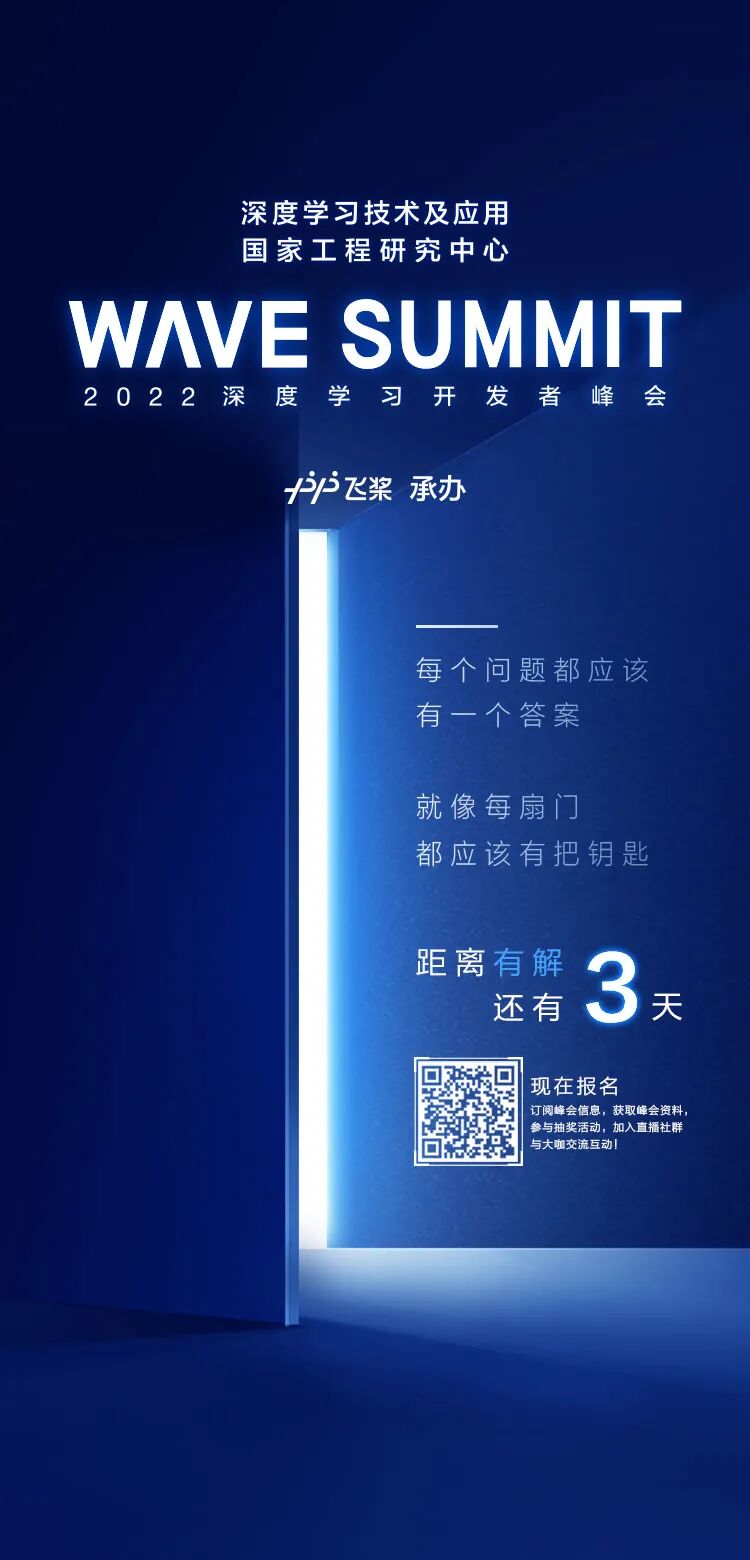 由深度学习技术及应用国家工程研究中心主办、飞桨承办的 WAVE SUMMIT 2022深度学习开发者峰会即将在3天后520当天如约而至,与你共赴解密之旅!