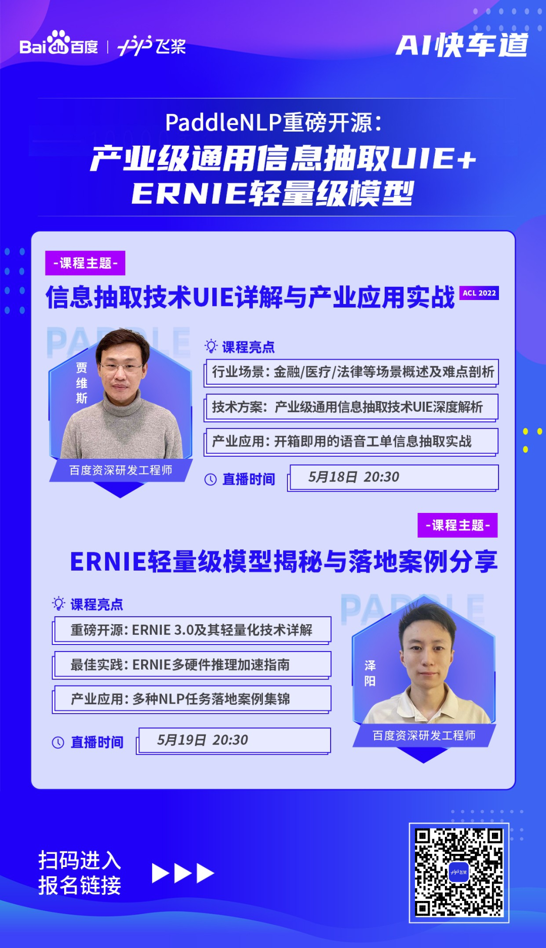 5.18-5.19日,百度高工将带来直播讲解,剖析信息抽取行业应用痛点,解读PaddleNLP信息抽取方案,并手把手带您进行项目实战。此外,还将带来ERNIE 3.0压缩部署和产业实践噢,欢迎大家扫码进群,获取课程链接!