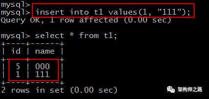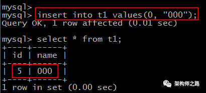 因此,在第四步delete删除所有4条记录后,自增列计数,并不会重新归0,也就是说,下一条insert的记录,自增列的值会是5。知识点二:含自增列的表,插入时可以手动指定自增列的值,但不能与已有值冲突,也可以使用系统默认自增列的值。知识点三:如果手动指定自增列的值是0或者NULL,MySQL会视为无效,并使用系统默认自增列的值。