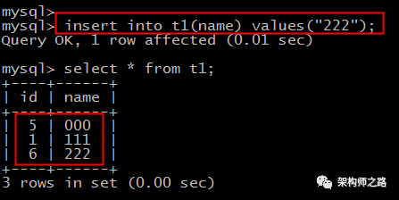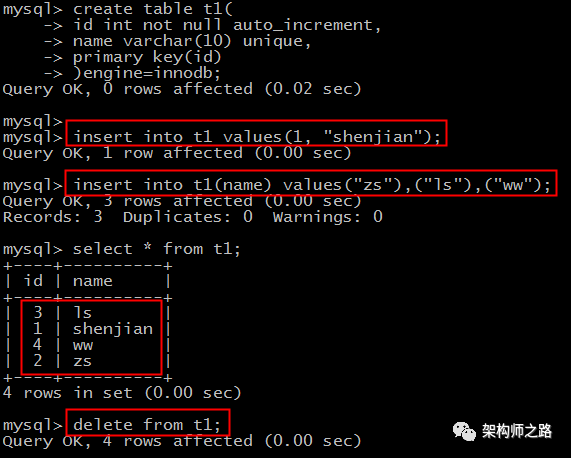 知识点一:delete数据后,自增列计数不会从头开始。画外音:truncate数据后,自增列计数会从头开始。