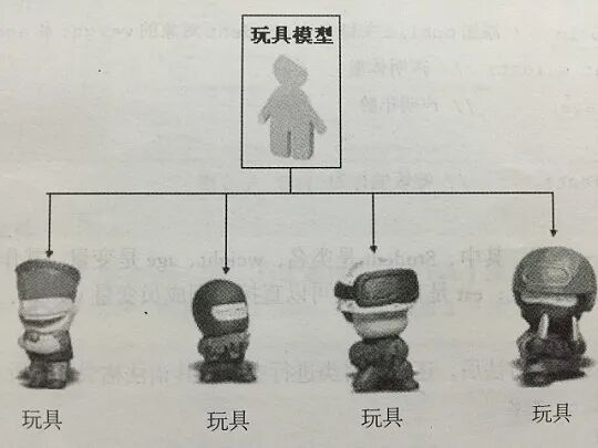 下图中,玩具模型就可以代表一个类,而具体生产出来的玩具就可以代表一个对象: