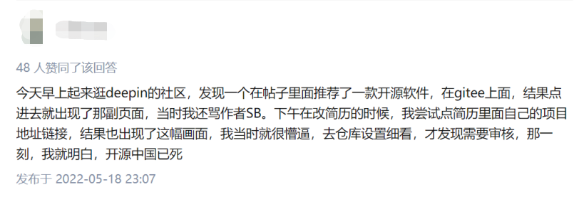 在得知Gitee仓库开源须审核通过后才能公开这个消息后,有人担心国内的开源精神将会就此萎缩。
