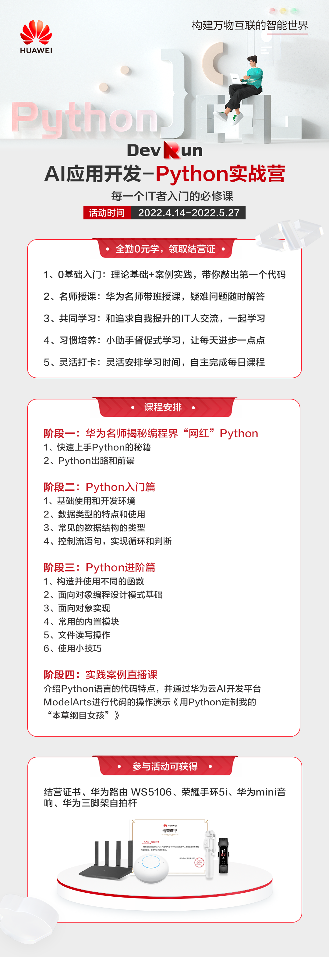 华为云专家将从Python环境搭建开始,带开发者走进Python的世界,了解Python独特的语法和应用于AI领域的框架工具;同时结合实践操作,增强您的编程能力,基础+进阶+实践内容,0门槛帮助您快速成长为Python程序高手。