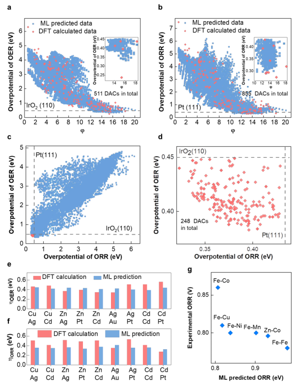 结合所有预测结果,本文提出了一种描述双原子催化剂活性的描述符φ,其计算结果与机器学习预测结果的对比如图5a和5b所示。由图可以看出,具有更高φ值的双原子催化剂具有更好的OER和ORR催化活性。在这些双原子催化剂结构中,共有511个双原子催化剂的OER催化活性优于IrO2(110)催化活性,共有855个双原子的ORR催化活性优于Pt(111)催化活性。其中,248个双原子的OER和ORR催化活性同时好于IrO2(110)的OER催化活性和Pt(111)的ORR催化活性(如图5c, 5d所示),该248个高性能双原子催化剂中有64个双原子组合为非贵重金属。验证计算如图5e和5f所示,机器学习预测结果与DFT计算结果差小于0.1eV。表明本文的机器学习模型具有极高的精度。此外,机器学习模型预测双原子催化剂的ORR催化活性趋势与实验获得的趋势一致,进一步证明了机器学习模型的准确性(如图5g所示)。