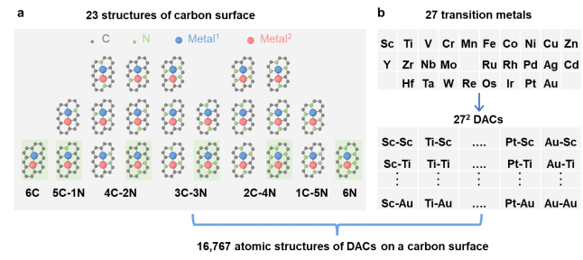 本文以碳基底材料和过渡金属为研究对象,利用基于拓扑结构的机器学习与第一性原理计算结合的方法,从16,767个双原子结构中筛选出了511个OER催化性能超过IrO