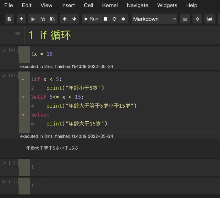 这里我们就可以看一下,如果 x 等于 10,在这个 if 循环里会得到的结果就是:年龄大于等于5岁小于15岁。