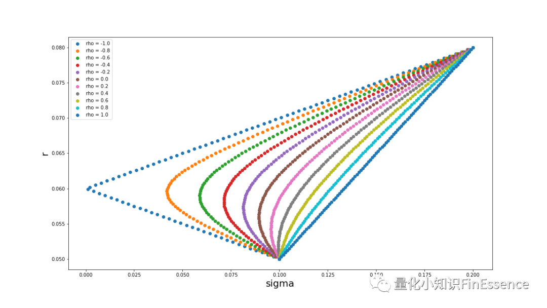 result = pd.DataFrame(columns = ['rho','wa','rp','sp']) for rhos in rho: for was in wa: rp,sp = portfolio1(ra,rb,sa,sb,rhos,was) x = pd.DataFrame([rhos,was,rp,sp]).T x.columns = ['rho','wa','rp','sp'] result = result.append(x) result = result.reset_index(drop = True)