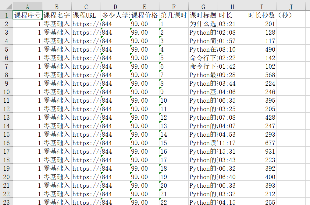 # 课时、关于我们等关键词出现了,页面就是加载完毕 WebDriverWait(self.driver, timeout=10).until( lambda x: "关于我们" in self.driver.page_source and "课时" in self.driver.page_source) # time.sleep(1) js = 'window.scrollTo(0, document.body.scrollHeight)' self.driver.execute_script(js) # time.sleep(1) page_text = self.driver.page_source html = etree.HTML(page_text) # 课程名字 name = html.xpath('//*[@class="u-coursetitle f-fl"]/h2/span/text()' )[0] # 多少人学过 many_people = html.xpath('//*[@class="u-coursetitle f-fl"]/div/span[1]/text()' )[0].replace('人学过' , '' ) # 课程价格 price = html.xpath('//*[@class="price"]/text()' )[0].replace('¥ ' , '' ) nodes = html.xpath('//*[@class="section"]' ) for node in nodes: # 第几课时 class_hour = node.xpath('./span[1]/text()' )[0].replace('课时' , '' ) # 课程标题 class_title = node.xpath('./span[3]/text()' )[0] # 时长,时长有空的情况需要判断 duration = node.xpath('./span[4]/span[1]/text()' ) duration = duration[0] if len(duration) > 0 else '无时长' # 时长切分成分和秒 if duration != '无时长' : duration_split = duration.split(':' ) # 时长秒数 duration_second = int(duration_split[0]) * 60 + int(duration_split[1]) content = [idx + 1, name, url, many_people, price, class_hour, class_title, duration, duration_second] # 调用写excel方法 self.write_excel(content) print (content, '写入excel成功' ) else : duration_second = '无秒数' content = [idx + 1, name, url, many_people, price, class_hour, class_title, duration, duration_second] # 调用写excel方法 self.write_excel(content) print (content, '写入excel成功' ) # 写excel def write_excel(self, content): # 添加数据 self.ws1.append(content) # 保存文件 self.wb.save(filename=self.dest_filename) # 主函数 def main(self): # 开始时间 start_time = time.time() # 统一获取driver self.driver = webdriver.Chrome() # 调用获取每个课程的详细信息方法 self.getEachCourseDetailed() # 总耗时 use_time = int(time.time()) - int(start_time) print (f'爬取总计耗时:{use_time}秒' ) # 退出 self.driver.quit()if __name__ == '__main__' : wyykt = WangYiYunKeTang() wyykt.main()当然,中间调试花了一些时间,因为获取到html页面后用xpath定位元素的时候没有找对,反复调试了一番。运行程序之后,只花了85s的时间就完成了数据的爬取,在没有用到并发技术情况下还算比较快的了。