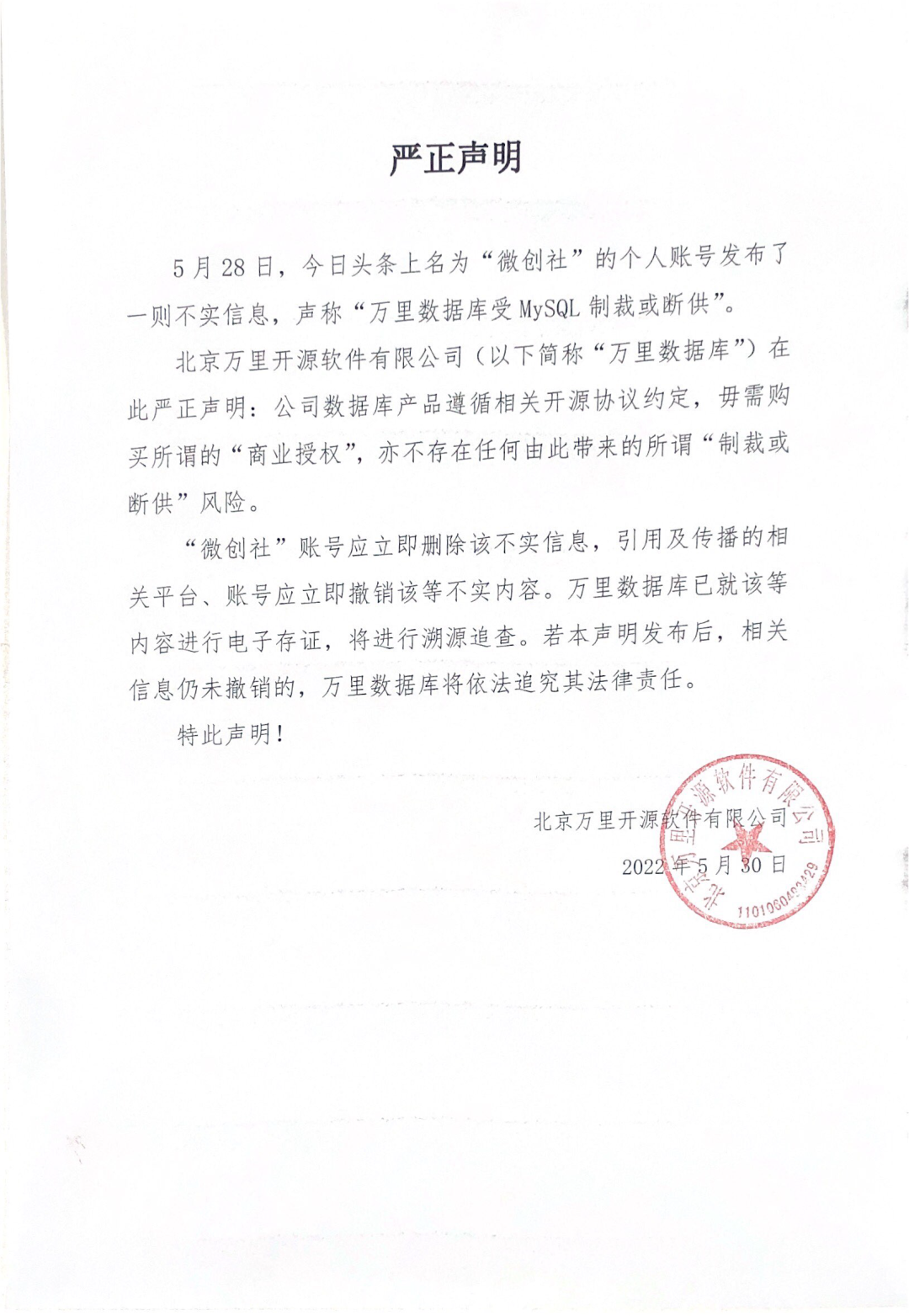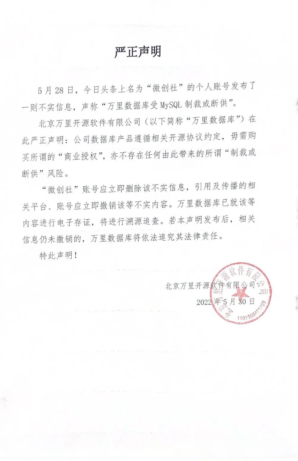 5月30日,万里数据库发布关于互联网平台账号恶意诽谤我司的严正声明,全文如下: