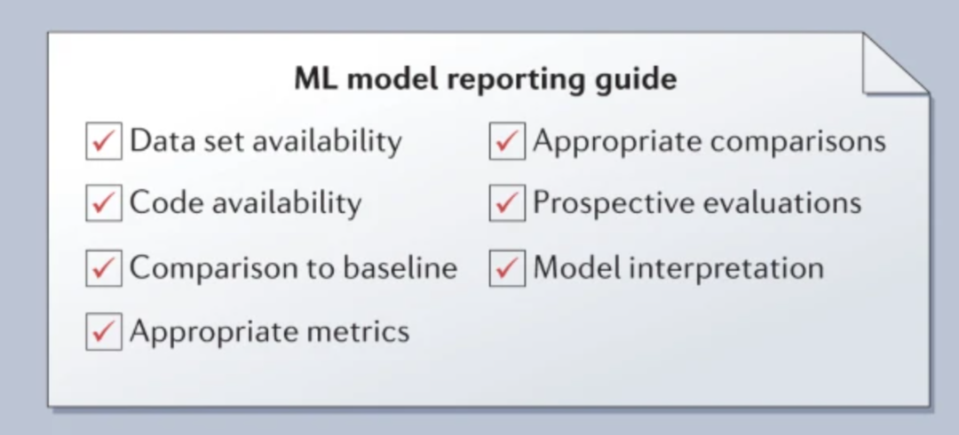 建议分为不同的类别——数据/代码报告;回顾性评估;与基线比较;前瞻性评估和模型解释——旨在提高三种机器学习研究类型中方法的质量、可转移性和重用性。