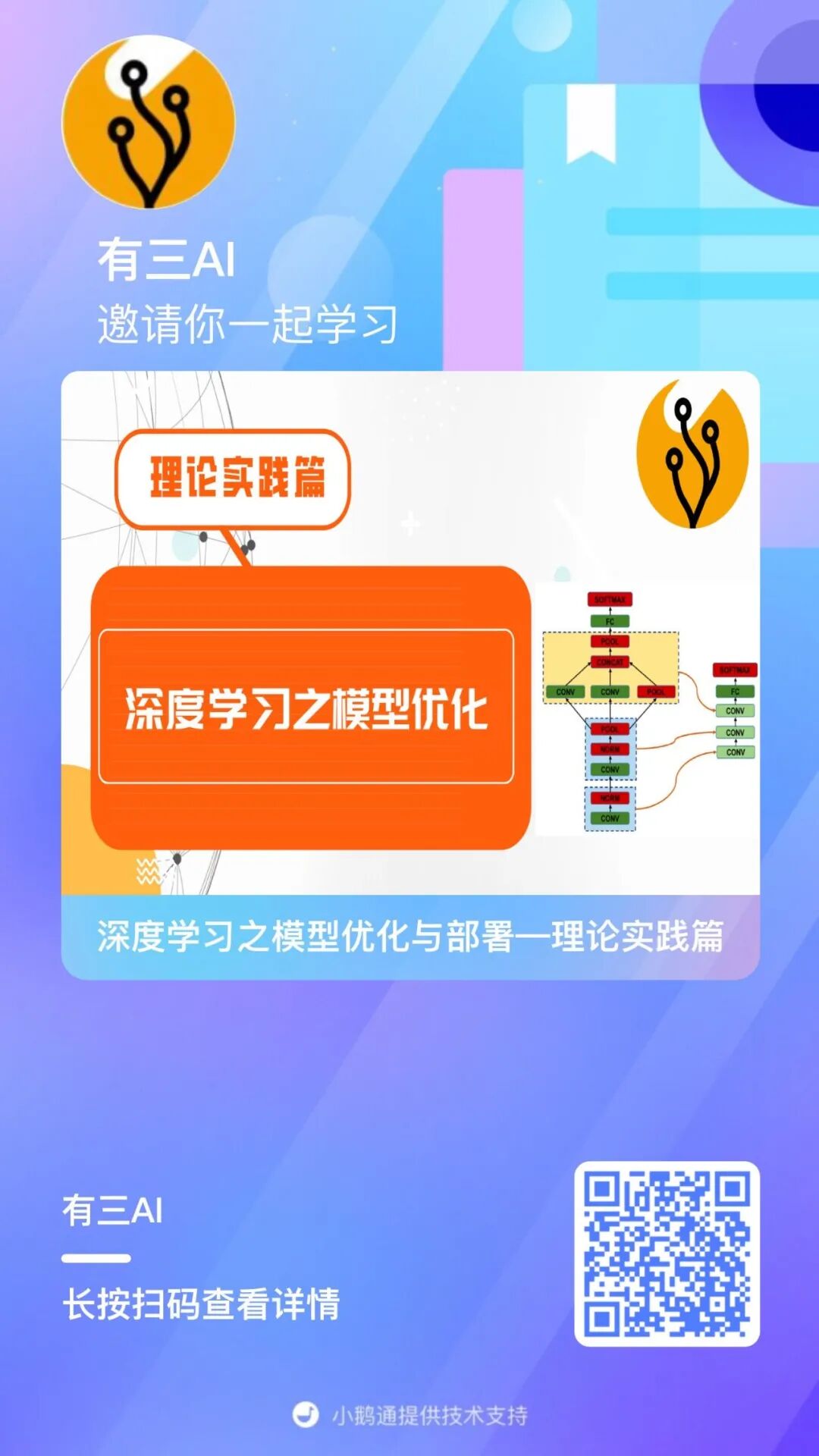 为了让大家能够更加系统更加深入的掌握模型优化相关的内容,有三AI推出了《深度学习之模型优化-理论实践篇》系列课程,为大家深入掌握深度学习模型优化相关方法以及实践打下基础。