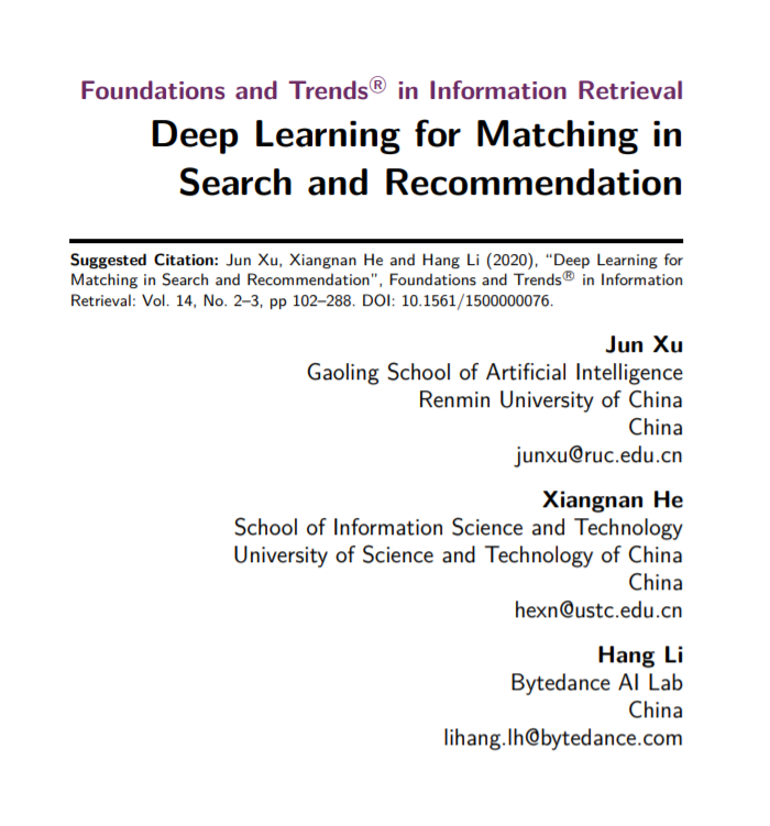 李航最新《搜索与推荐中的深度学习匹配》新书,190页pdf(附下载)
