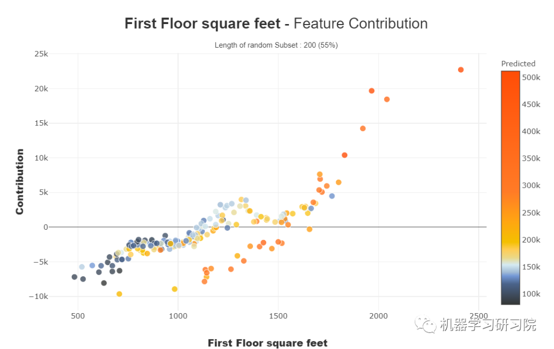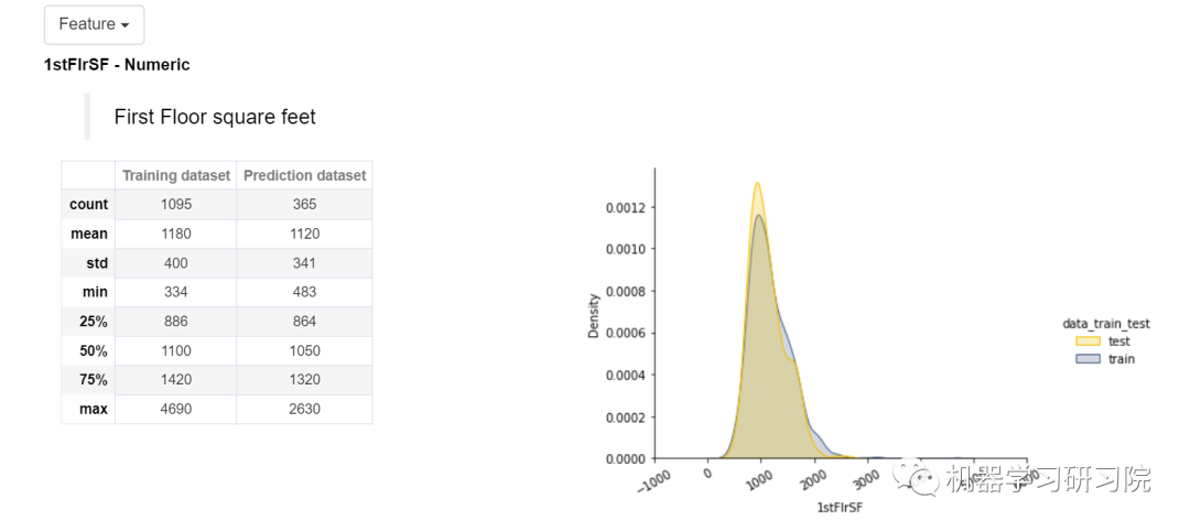 使用可以查看下图,了解名为First Floor Square Feet的要素。我们可以看到一个表格,其中显示了我们的训练和测试数据集的多种统计数据,例如平均值、最大值、最小值、标准偏差、中位数等等。在右侧图中可以看到训练和测试数据集的分布图。Shapash 还提到了我们的特征是分类的还是数字的,它还提供了下拉选项,在下拉菜单中所有功能都可用。