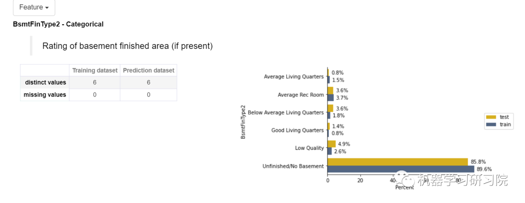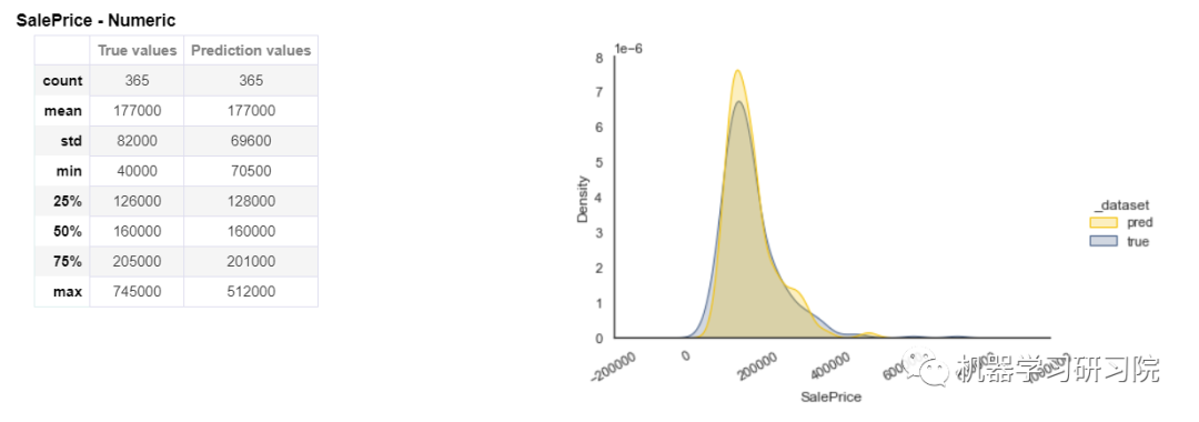还可以看到对名为 Sales Price 的目标变量的详细分析。在左侧,显示了所有统计数据,如计数、平均值、标准差、最小值、最大值、中位数等,用于训练和预测数据集。在右侧,显示了训练和预测数据集的分布。