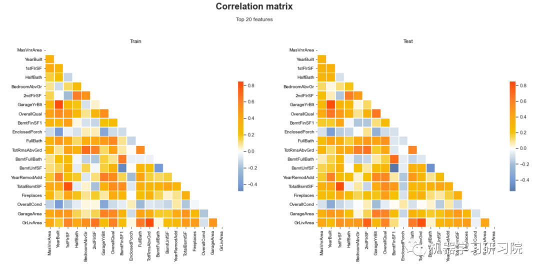 上面我们 详细讨论了单变量分析。在本节中,我们将看到多元分析。下图显示了训练和测试数据集的前 20 个特征的相关矩阵。还根据不同的颜色显示了相关性标度。这就是我们如何使用 Shapash 可视化特征之间的关系。