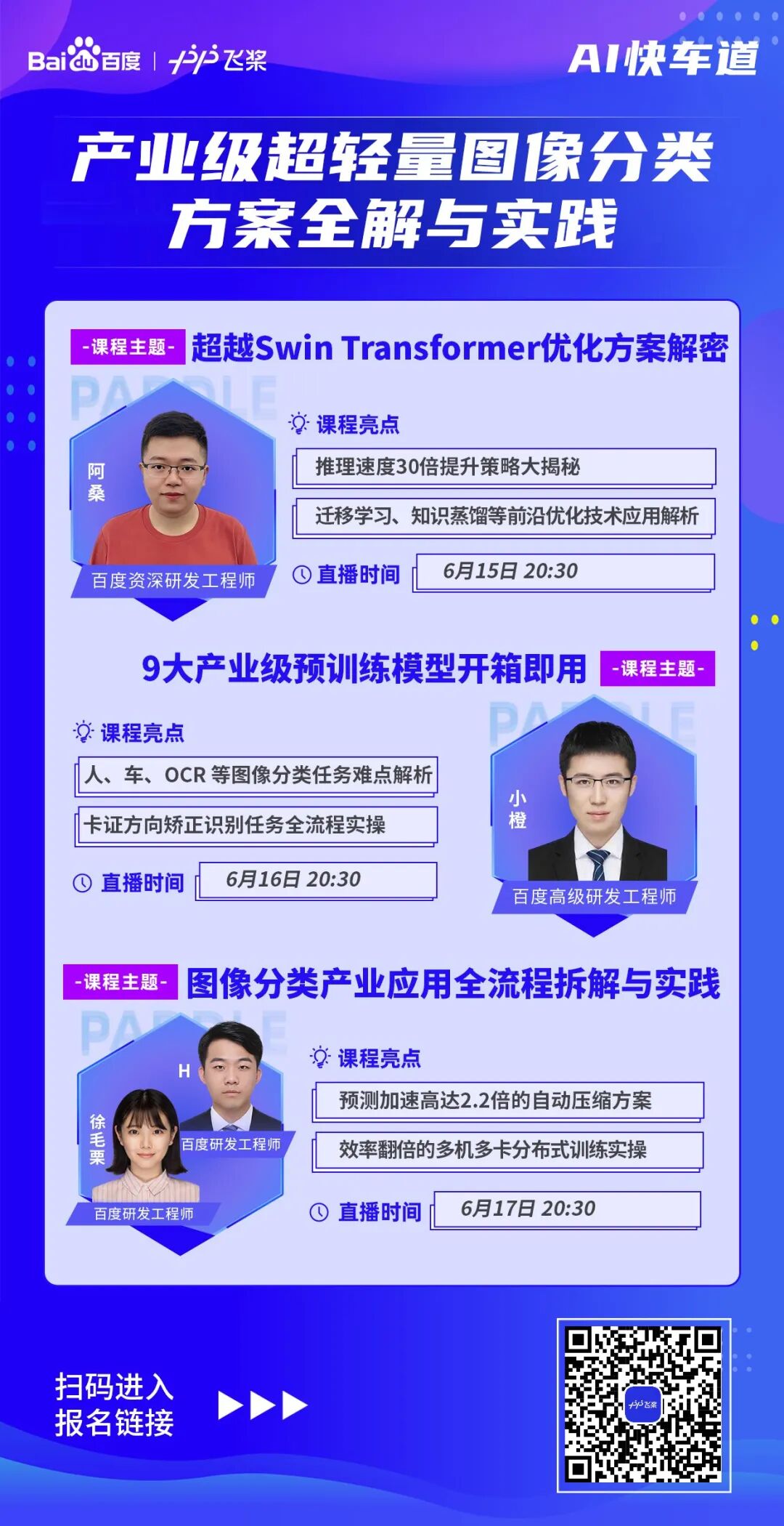 为了让开发者们更深入的了解 PaddleClas 这次 发布的全新内容,解决落地应用难点,掌握产业实践的核心能力,6月15-6月17日晚20:30飞桨团队精心准备了为期三天的直播课程!