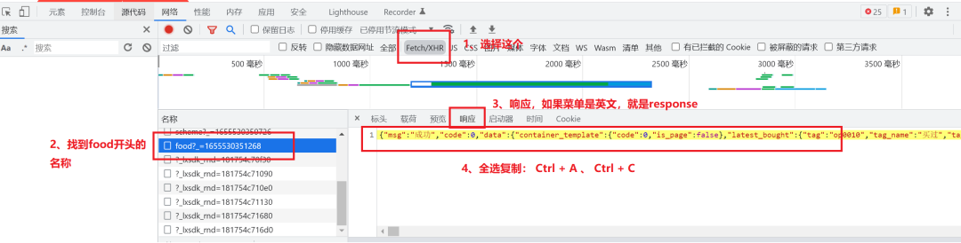 巨坑注意:虽然PC端无法通过滚动条验证步骤,但是该动作还是要做的,否则即使填入了手机获取到的验证码,是无法提交登录的。(与甲方共同测试时,在这个环节卡了好久) 该步骤不难,F12打开chrome的开发者模式,进入店铺后,使用关键词搜索一下,就能发现,所有的菜品,都在一个food的response中