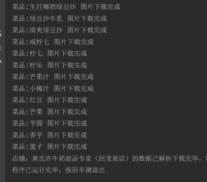 with open(filename, "wb" ) as code: for chunk in file.iter_content(chunk_size=1024 ): # 边下载边存硬盘 if chunk: code.write(chunk) @classmethod def get_pictures (cls, shop_name: str, data: pd.DataFrame, pic_dir: pl.Path) : """ 批量获取图片数据的方法 :param shop_name: 店铺名 :param data: 数据 :param pic_dir: 图片存放的目录 :return: """ print(f'开始下载店铺:{shop_name} 的图片' ) # 下载前按照菜品名称与图片地址进行去重处理,减少请求数量 download_data = data.copy() download_data = download_data.drop_duplicates(['name' , 'picture' ], keep='last' ) # 筛选去除图片地址为空的 download_data = download_data.loc[ (download_data['picture' ].map(lambda x: pd.notnull(x))) | (download_data['picture' ] != '' ) ] max_len = len(download_data) for idx, food in enumerate(download_data.to_dict(orient='records' )): # 遍历数据 pic_url = food['picture' ] # 拆分获取图片扩展名 suffix = pl.Path(pic_url.split('/' )[-1 ]).suffix # 加工出图片的路径(包含名称) name = food['name' ].replace('\\' , '_' ).replace('/' , '_' ) filename = pic_dir / f"{name} {suffix} " # 使用下载方法下载 try : cls.download_picture(pic_url, filename) print(f'({idx+1 } /{max_len} )菜品:{food["name" ]} 图片下载完成' ) except Exception as e: print(f'!!!({idx+1 } /{max_len} )菜品:{food["name" ]} 图片下载失败,错误提示是: {e} ' ) # 随机暂停 time.sleep(randint(1 , 3 ) / 10 ) @classmethod def write_data (cls, shop_name, data, shop_dir) : """ 将数据输出至excel文件 :param shop_name: 店铺名 :param data: 数据 :param shop_dir: 店铺存放的文件夹 :return: """ data.to_excel(shop_dir / f'{shop_name} .xlsx' , index=False ) def run (self) : """ 运行程序 :return: """ try : for filename in self.file_path.iterdir(): # 先解析人工取得的数据 shop_name, data = self.parse_data(filename) # 再创建文件夹 shop_dir, pic_dir = self.create_dir(shop_name) # 写入Excel文件 self.write_data(shop_name, data, shop_dir) # 获取图片 self.get_pictures(shop_name, data, pic_dir) print(f'店铺:{shop_name} 的数据已解析下载完毕,数据存储在:“{shop_dir.absolute()} ”路径下' ) return True , None except Exception as e: return False , eif __name__ == '__main__' : spider = SpiderObj() res, err = spider.run() if res: input('程序已运行完毕,按回车键退出' ) else : input(f'程序运行出错,错误提示是: {err} ' )大功告成 总结 不管全自动还是半自动,能解决问题的都是好爬虫。最后实现的爬虫实际上使用到的知识点都不是困难的: