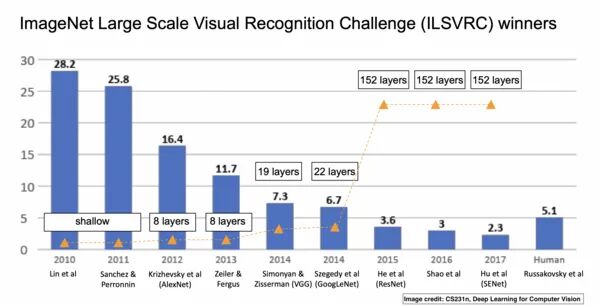 在随后的几年里,ConvNets 架构不断变得更大并且工作得更好。例如,有 19 层的 VGG 以 7.3% 的错误率赢得了挑战。GoogLeNet(Inception-v1) 更进一步,将错误率降低到 6.7%。2015 年,ResNet(Deep Residual Networks)扩展了这一点,并将错误率降低到 3.6%,并表明通过残差连接,我们可以训练更深的网络(超过 100 层),在此之前,训练如此深的网络是不可能的。之前人们发现更深层次的网络工作得更好,这导致了其他新架构,如 ResNeXt、Inception-ResNet、DenseNet、Xception 等。