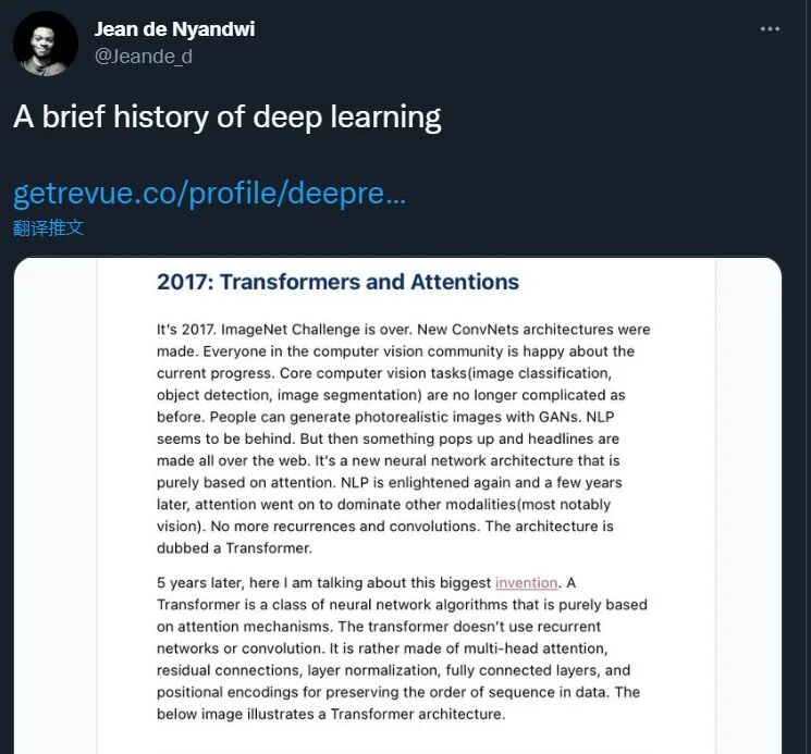 2017 年:Transformers 和注意力机制 时间来到 2017 年。ImageNet 挑战赛结束了。新的卷积网络架构也被制作出来。计算机视觉社区的每个人都对当前的进展感到高兴。核心计算机视觉任务(图像分类、目标检测、图像分割)不再像以前那样复杂。人们可以使用 GAN 生成逼真的图像。NLP 似乎落后了。但是随后出现了一些事情,并且在整个网络上都成为了头条新闻:一种完全基于注意力机制的新神经网络架构横空出世。并且 NLP 再次受到启发,在随后的几年,注意力机制继续主导其他方向(最显著的是视觉)。该架构被称为 Transformer 。
