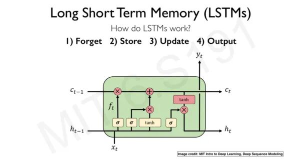 LSTM 架构。图片取自 MIT 的课程《6.S191 Introduction to Deep Learning》 LSTM 处理长序列的能力使其成为适合各种序列任务的神经网络架构,例如文本分类、情感分析、语音识别、图像标题生成和机器翻译。
