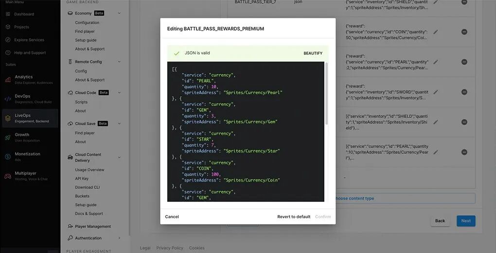 战斗通行证的所有奖励等级,即游戏代币及物品,都是用 Economy (beta) 管理的。我们还用 Economy 设置了一项用宝石换取通行证的购买选项。