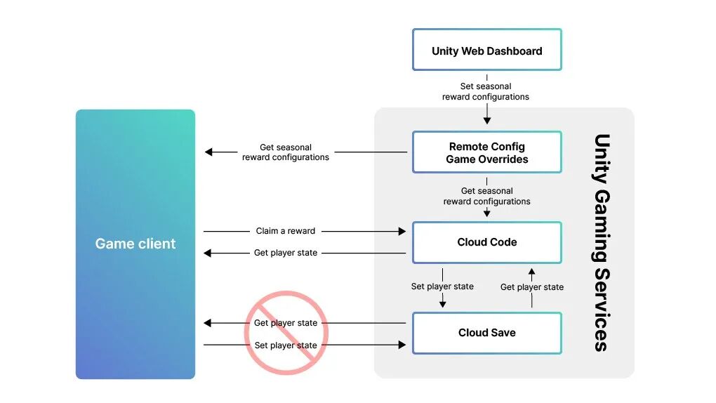 客户端从 Game Overrides 或 Cloud Code(只读)获取季节性奖励的配置数据。客户端使用这些数据来生成 UI。Cloud Code 将根据数据来决定玩家所能领取的等级奖励。