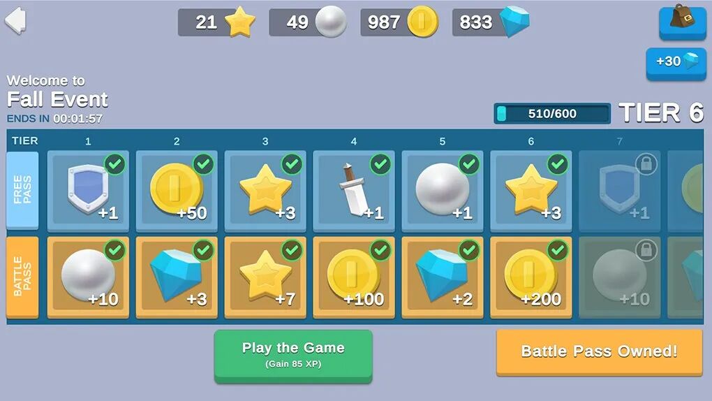 在这个样例中,大部分奖励都是游戏代币,但多人游戏更为常见的奖励是饰品。用户可以根据游戏联机与否来设计战斗通行证。