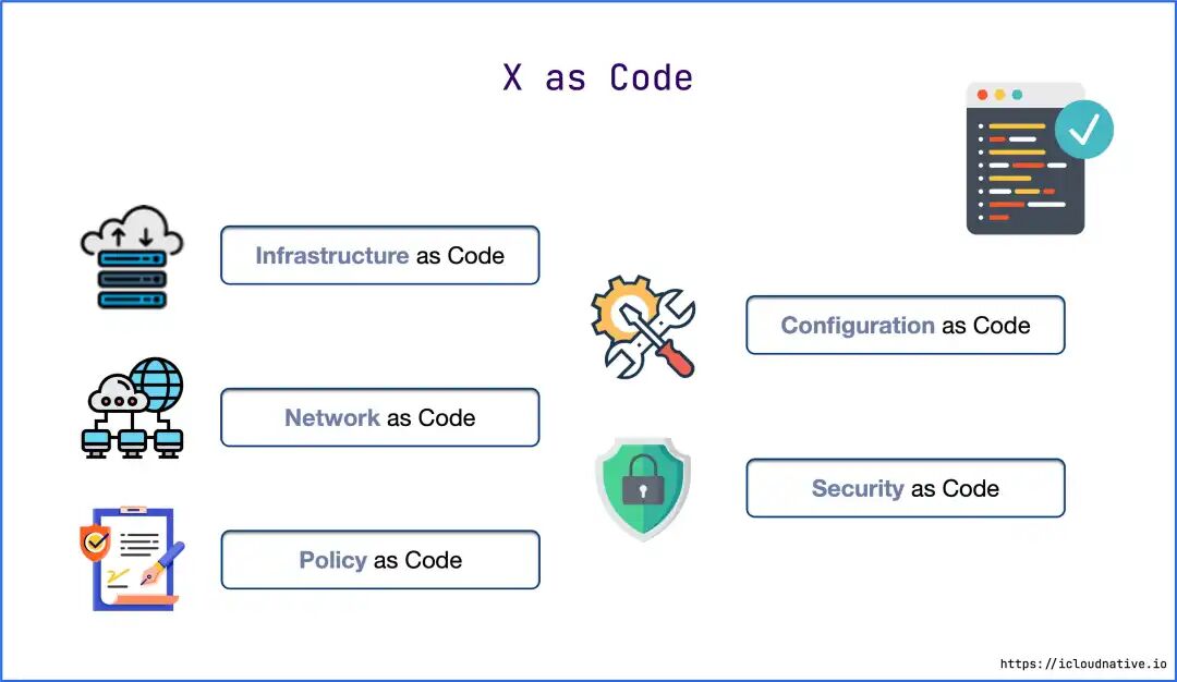 可以创建包含基础架构规范的声明式配置文件,从而便于编辑和分发配置。 可以进行版本控制,所有的变更都会被记录下来,方便溯源。 可以将基础设施划分为若干个模块化组件,并通过自动化以不同的方式进行组合。 当然,广义上的 IaC 不仅仅只关于基础设施,还包含了网络 、安全 、配置 等等,所以广义上的 IaC 又叫 X as Code 。