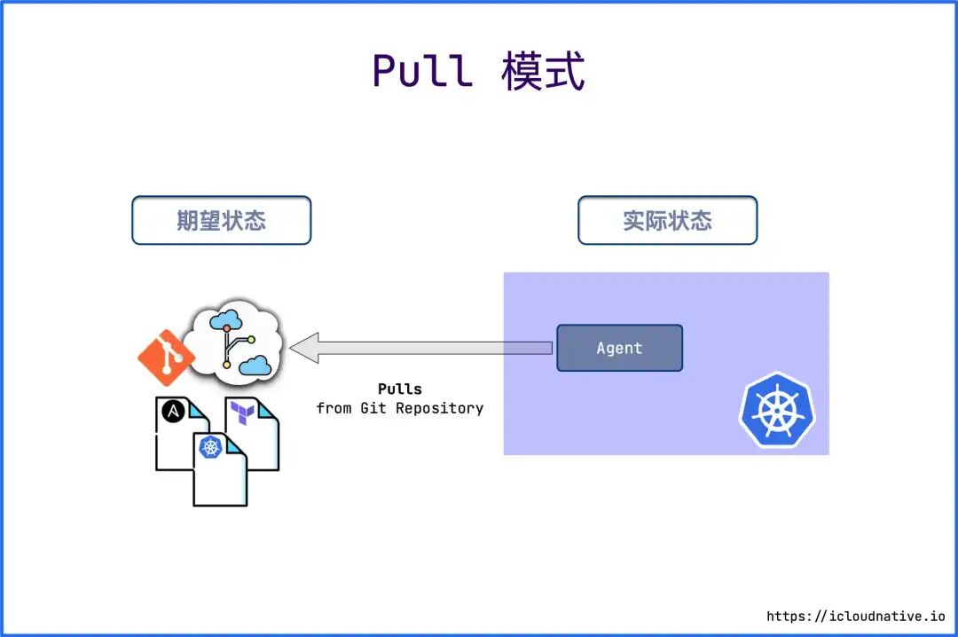 Pull 模式会在目标环境中安装一个 Agent,例如在 Kubernetes 集群中就靠 Operator 来充当这个 Agent。Operator 会周期性地监控目标环境的实际状态,并与 Git 仓库中的期望状态进行比较,如果实际状态不符合期望状态,Operator 就会更新基础设施的实际状态以匹配期望状态。
