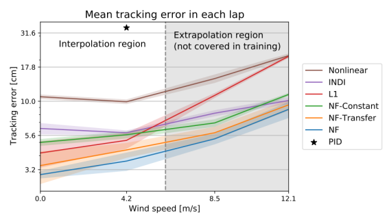 算法开发完毕后,下一步便是测试。课题组首先在风墙中测试了 Neural-Fly 的控制精度,并与其他一些自适应控制算法进行了横向对比。值得注意的是,他们测试的最高风速为 12m/s,而数据收集过程只包括了 0-6m/s 的风速。也就是说,其开发的 DAIML 算法所学到的基函数,有着很强的泛化能力。