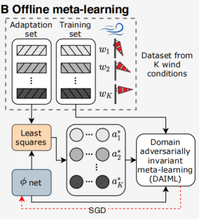 其核心思想如下。首先,该团队收集多个不同风况下的飞行数据。之后,他们开发了一种元学习算法(domain adversarially invariant meta-learning,DAIML)去优化一组能代表所有风况的基函数,这组基函数由一个深度神经网络表征。