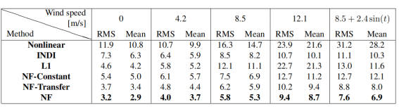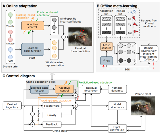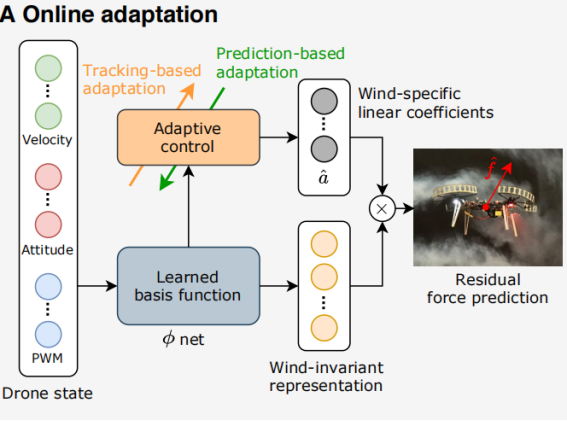 再后,其又开发了与之匹配的非线性自适应控制算法,来进行在线权重更新。换言之,处于离线阶段的 Neural-Fly,学习了能表示不同风况下空气动力学的一组基函数,然后在在线阶段通过 MRAC 的框架重新组合这组基函数。