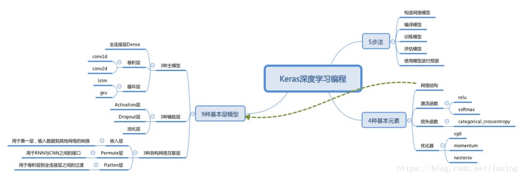 作为一个程序员,我们可以像学习编程一样学习深度学习模型开发。我们以 Keras 为例来说明。我们可以用 5 步 + 4 种基本元素 + 9 种基本层结构,这 5-4-9 模型来总结。